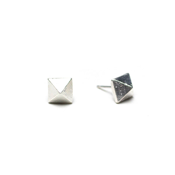 Raw Pyramid Silverv Studs. Cast and then finished and polished by hand. Sold in pairs. Dimensions: 8 x 8 x 15 mm - 0.30 x 0.30 x 0.60 in. Materials: Sterling silver with sterling silver earring post.