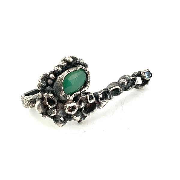 Wasp Nest ring is made of sterling silver oxidized to have the industrial look and set with chrysoprase and blue topaz. One of a kind hand-made, size 5, can be resized upon request.