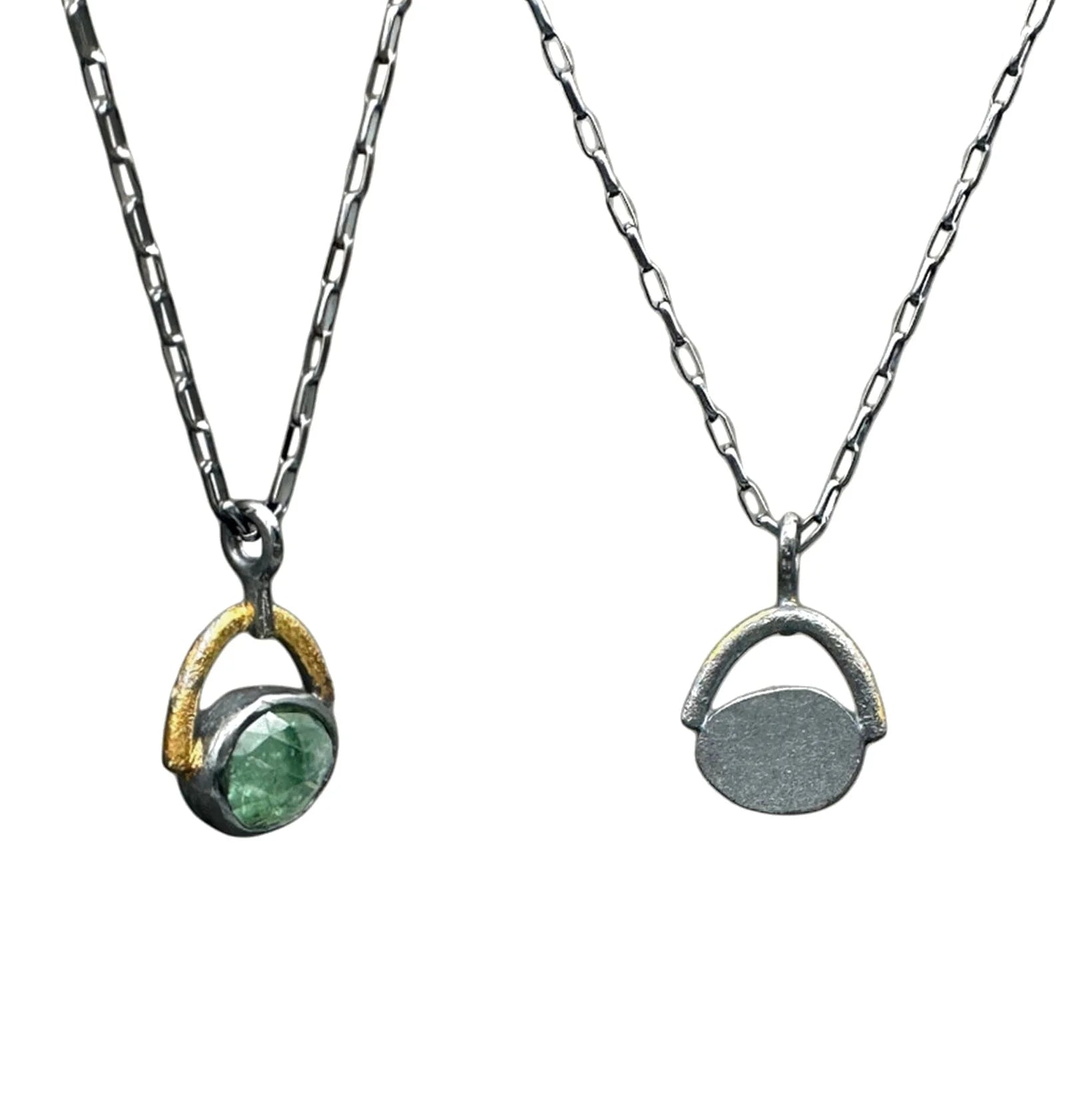 This pendant seamlessly blends ancient-rune inspirations with contemporary flair. It showcases a radiant green kyanite stone surrounded by a textured, oxidized silver frame embellished with 23K gold. The result is a versatile amulet that adds a touch of subtle color and natural shimmer to any outfit. Whether worn alone or layered with other pieces, this pendant boasts a rose-cut finish and the serene, grounding aura of spring-green kyanite for a harmonious mix of soothing and sparkle.