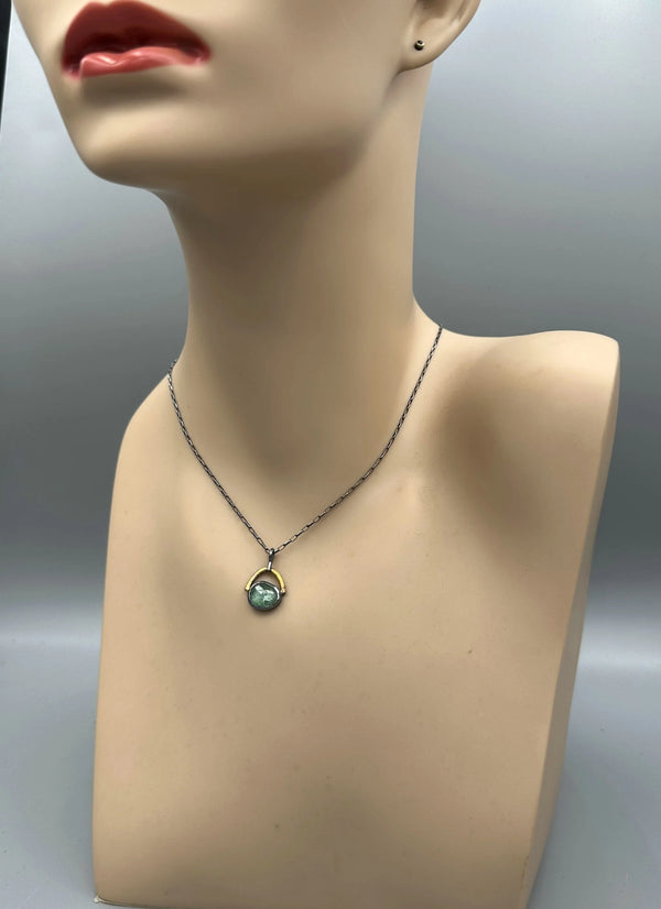 This pendant seamlessly blends ancient-rune inspirations with contemporary flair. It showcases a radiant green kyanite stone surrounded by a textured, oxidized silver frame embellished with 23K gold. The result is a versatile amulet that adds a touch of subtle color...