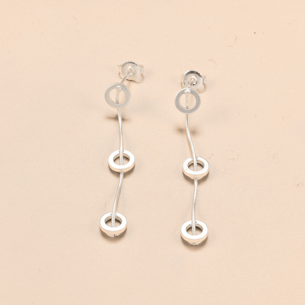 These refined post earrings are crafted from sterling silver with a subtle matte texture. Measuring 2" (50mm) long and 0.3" (8mm) wide, the design showcases three flat circles linked by a delicate silver snake chain. This geometric, contemporary piece offers a lightweight feel while delivering a striking, artistic presence.