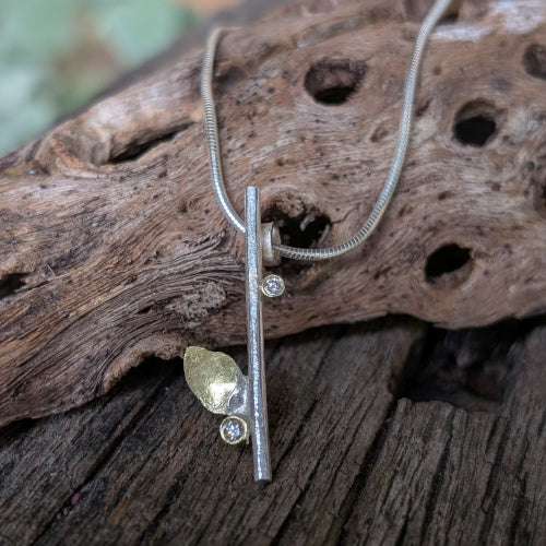 Material: Sterling Silver, 18ct Gold, DiamondsLength: 30mm pendant on 2mm textured silver wireStones: Three brilliant-cut diamonds – 2.0mm, 1.6mm, 1.4mm Delicate and refined, the Small Gold Leaf & Diamond Pendant is part of the Spring Leaf Collection, a celebration of...