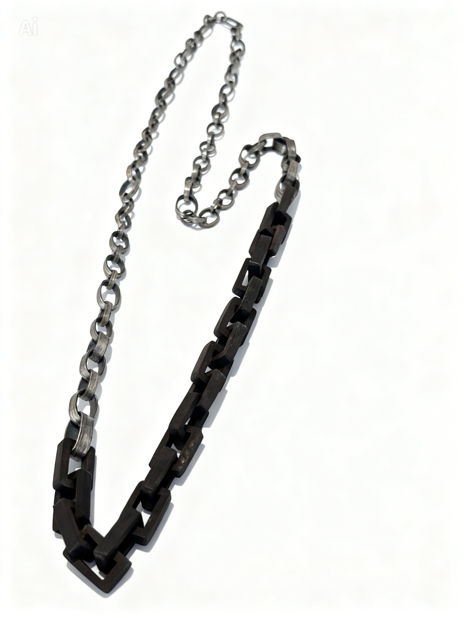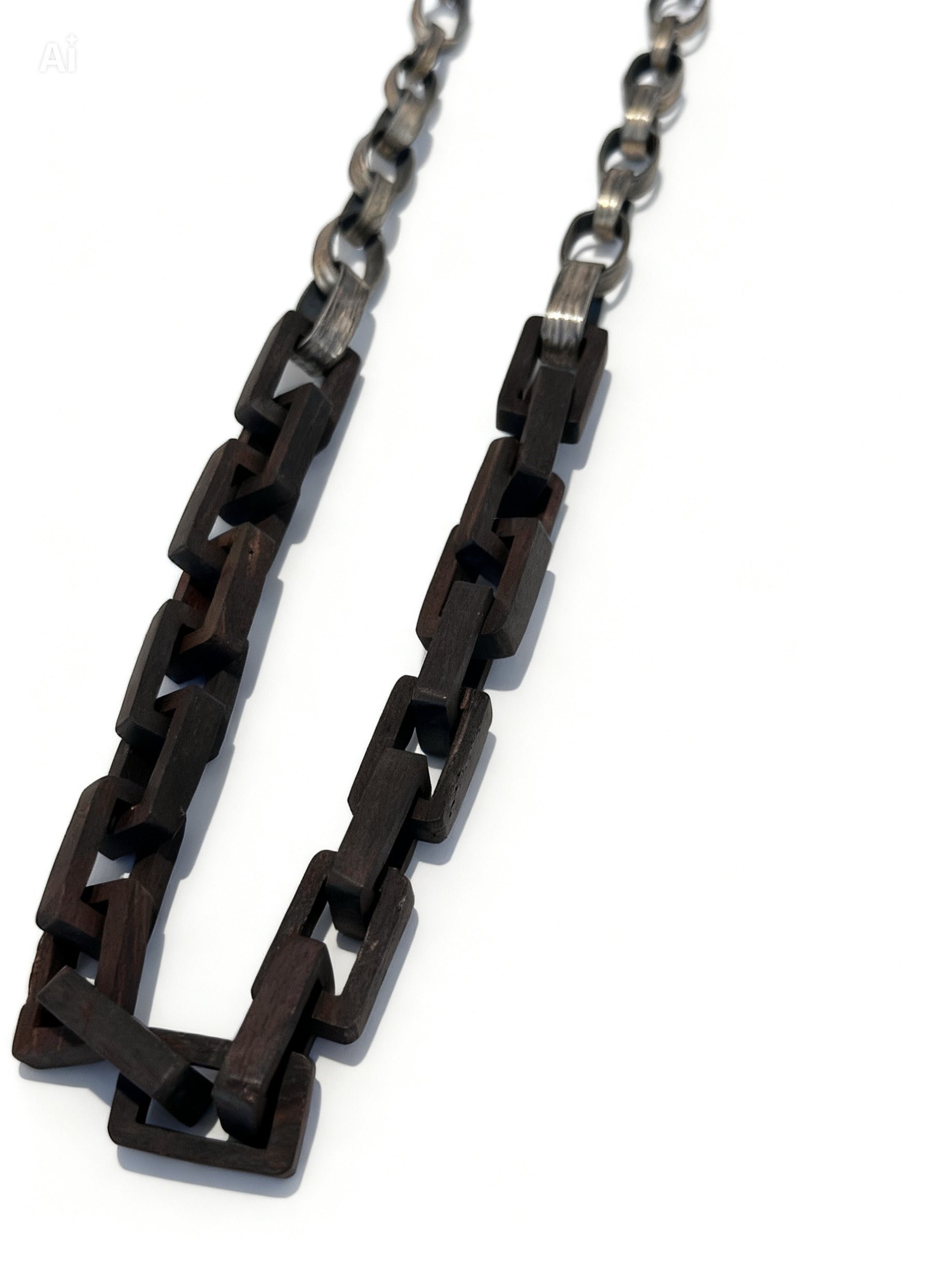 This distinctive wood link necklace blends organic materials with sculptural sterling silver accents. Each rectangular wood link measures approximately 20.8 mm long and 12.8 mm wide, creating a bold yet natural rhythm throughout the design.