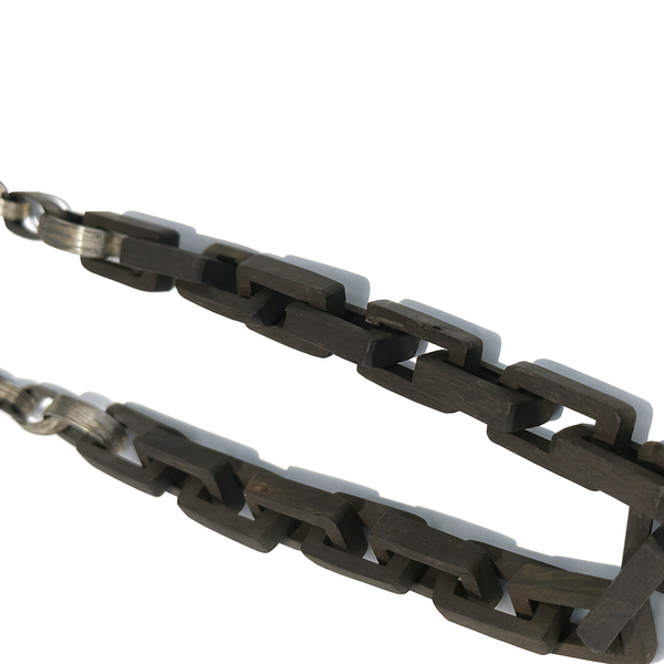 This distinctive wood link necklace blends organic materials with sculptural sterling silver accents. Each rectangular wood link measures approximately 20.8 mm long and 12.8 mm wide, creating a bold yet natural rhythm throughout the design. Between the wood links, etched...