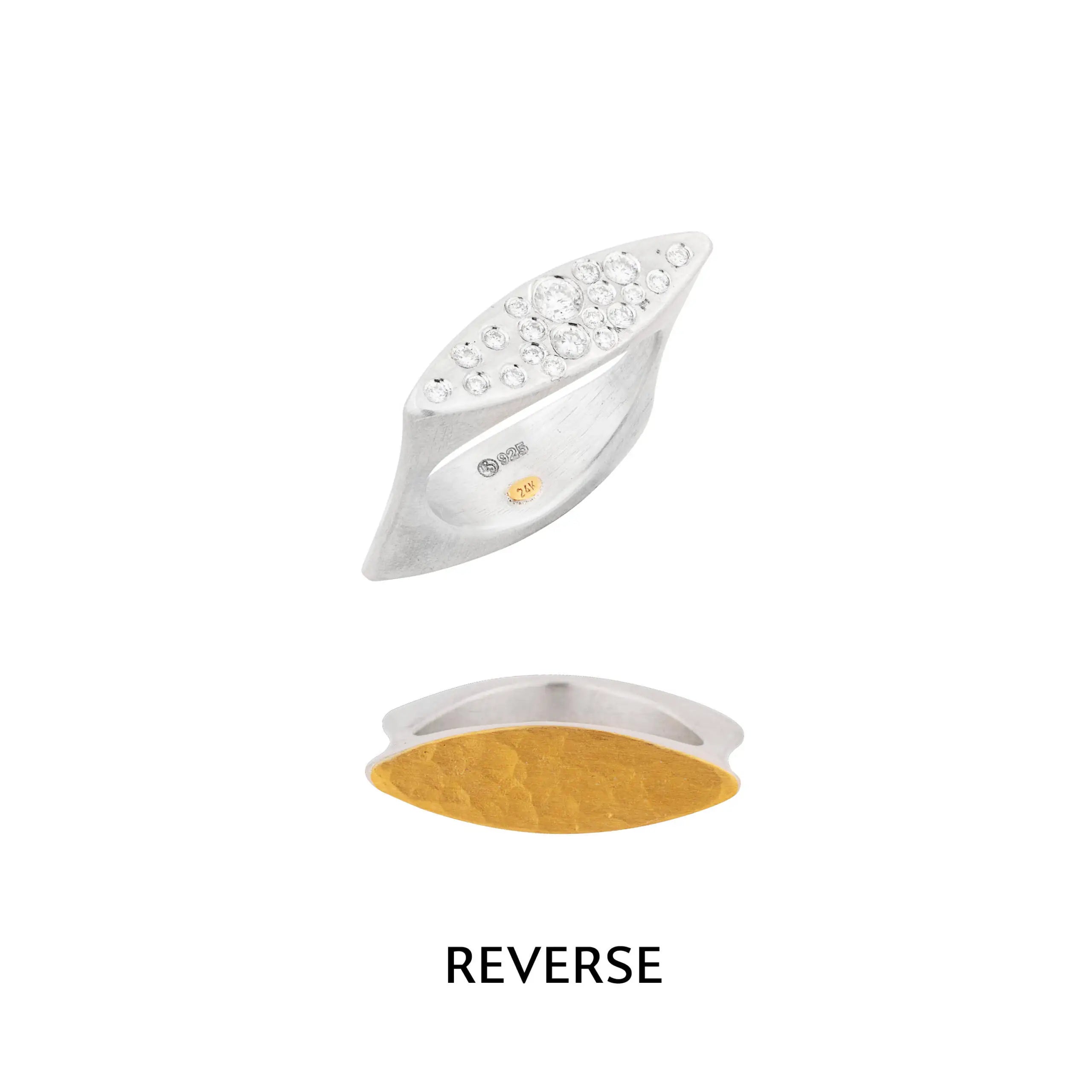 Elevate your jewelry collection with the Stockton Flipper Ring, a masterfully crafted reversible statement piece. This unique design features a flippable face—one side adorned with delicately sprinkled natural diamonds (0.28 ctw) over a rich 24K gold surface, and the other showcasing sleek, fused matte gold and sterling silver for a more understated look.
