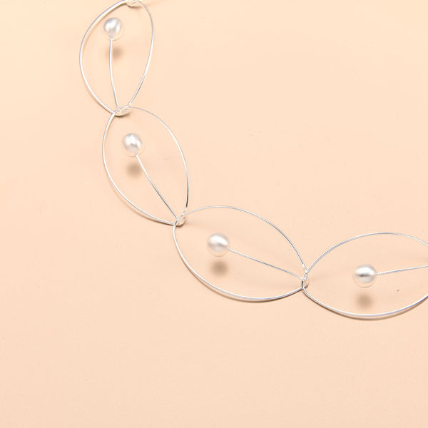 Crafted from 925 silver, this 3D necklace is made of eleven distinctive marquise shaped design with a floating silver ball atop, constructed from sterling silver wires, creating a lightweight and airy aesthetic. With a 20" length and measurements of 0.25"...